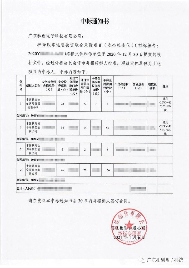 国家铁路集团总公司,公开招标铁路安全检查仪,在经过激烈的竞争之后,宝威·体育凭借良好的产品质量和优异的服务质量中标此次采购项目。中标安全检查设备,包括:“X光行李安检机、金属探测门、手持金属探测仪”。今后的一段时间宝威·体育电子需要为中铁哈尔滨局、南昌局、上海局和南宁局这四家铁路局提供中标通知书中所提到的所有安全检查仪。